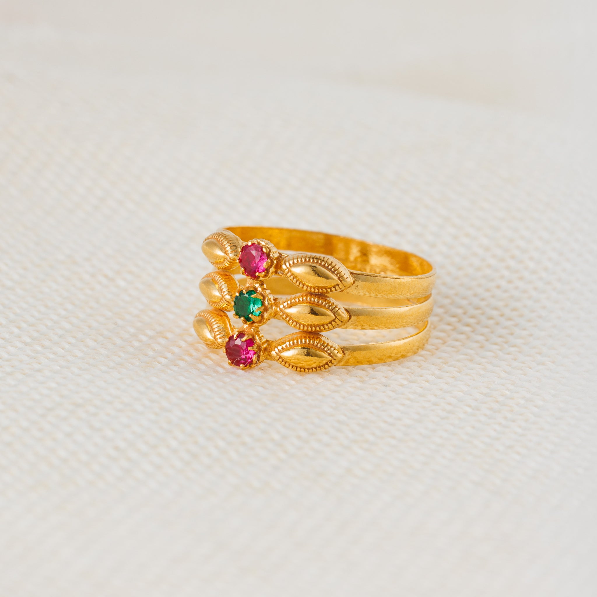Add a touch of elegance to your outfit with our Triple Ring. Made with high-quality silver and gold plating, this ring features eye-catching green and red fancy stones. Elevate your style and make a statement with this stunning piece.