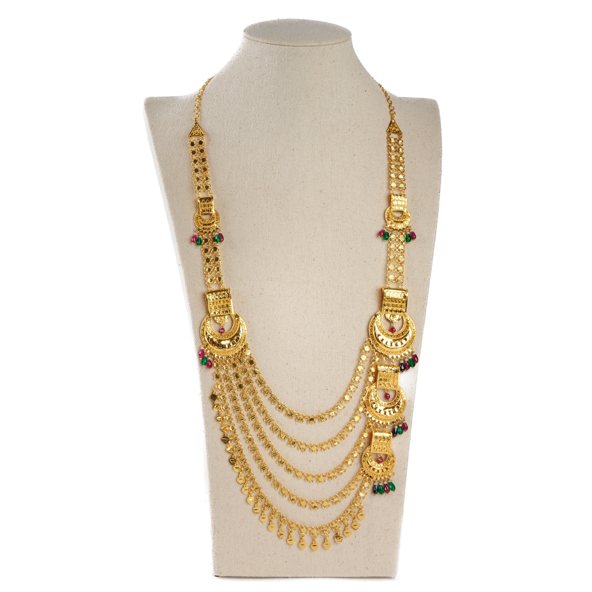 Indulge in luxury with our Layered Moon Moria (D1) necklace. This exquisite piece features a stunning combination of silver 925 and gold plating, adorned with shimmering red and green crystals. Elevate your style with this sophisticated and exclusive accessory.